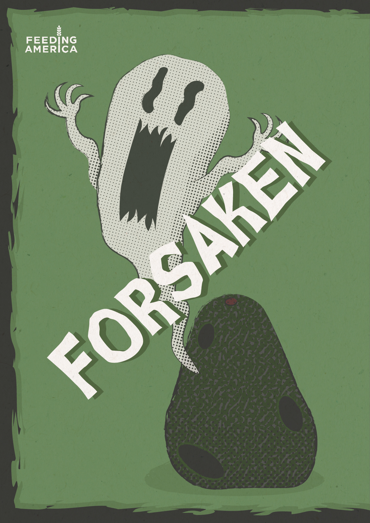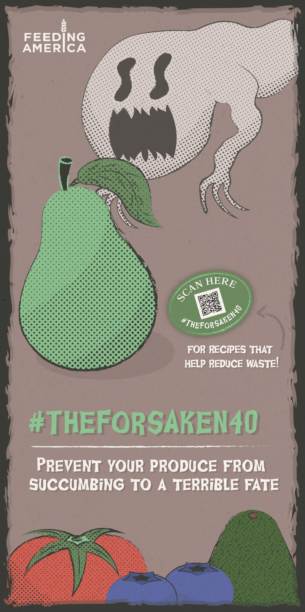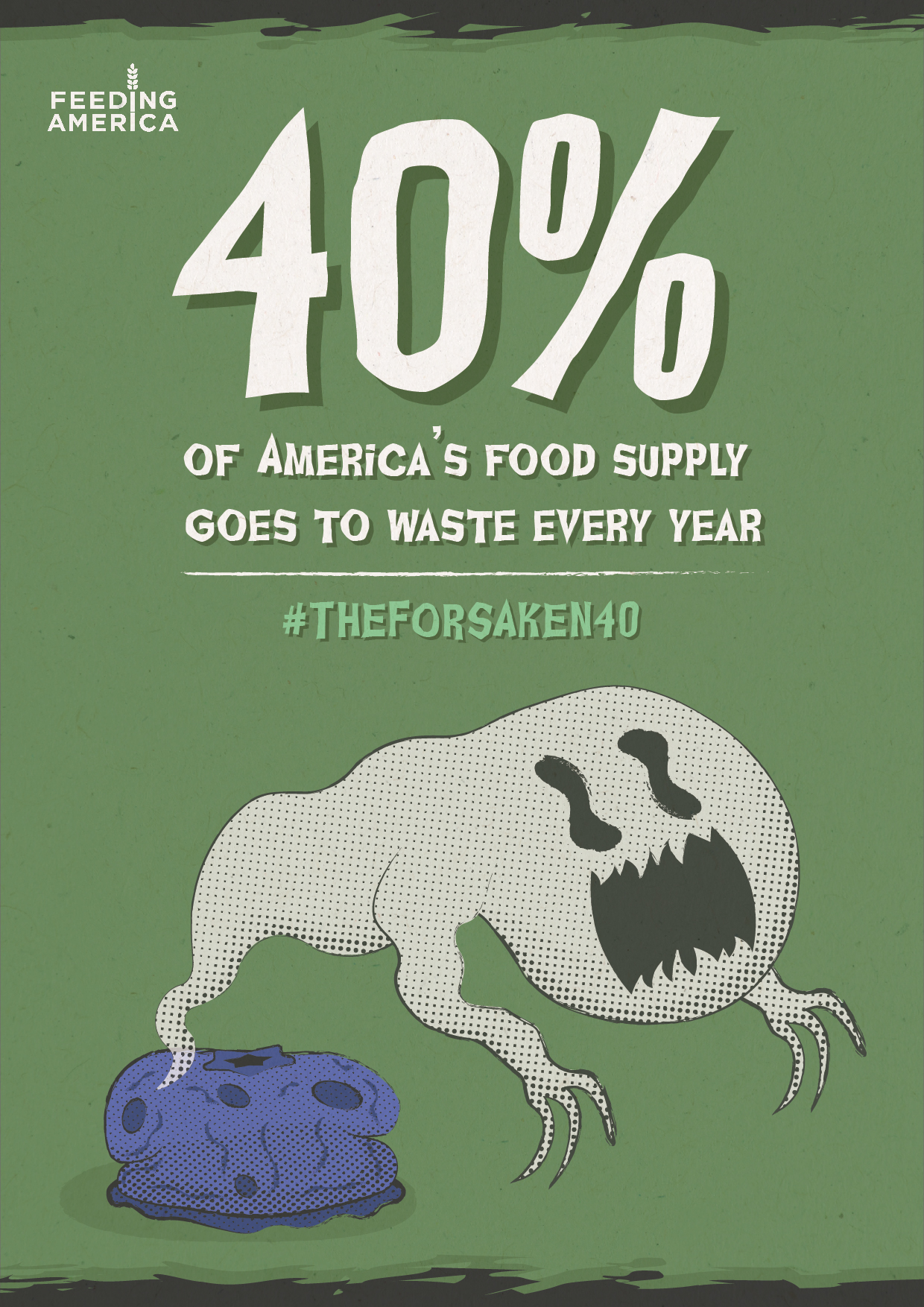 In this campaign for Feeding America, the harrowing 40% statistic is used to convey the horrors of food waste. This project uses retro horror visuals and haunting copy to convey the grave misfortune that befalls produce when it goes to waste. Textures and halftones along with dark muted colors were used to enhance the retro feel. #THEFORSAKEN40 encourages food shoppers to think before they buy.