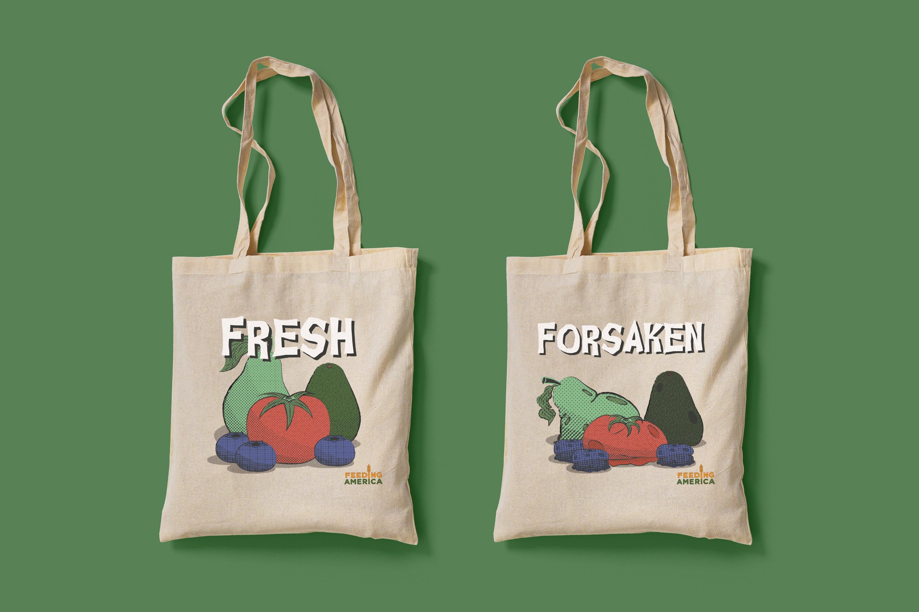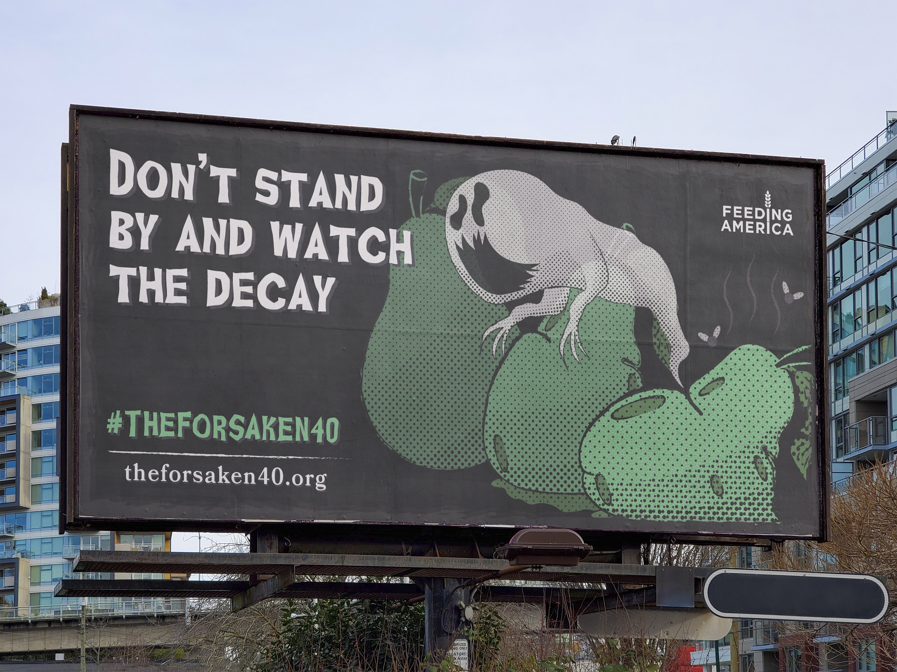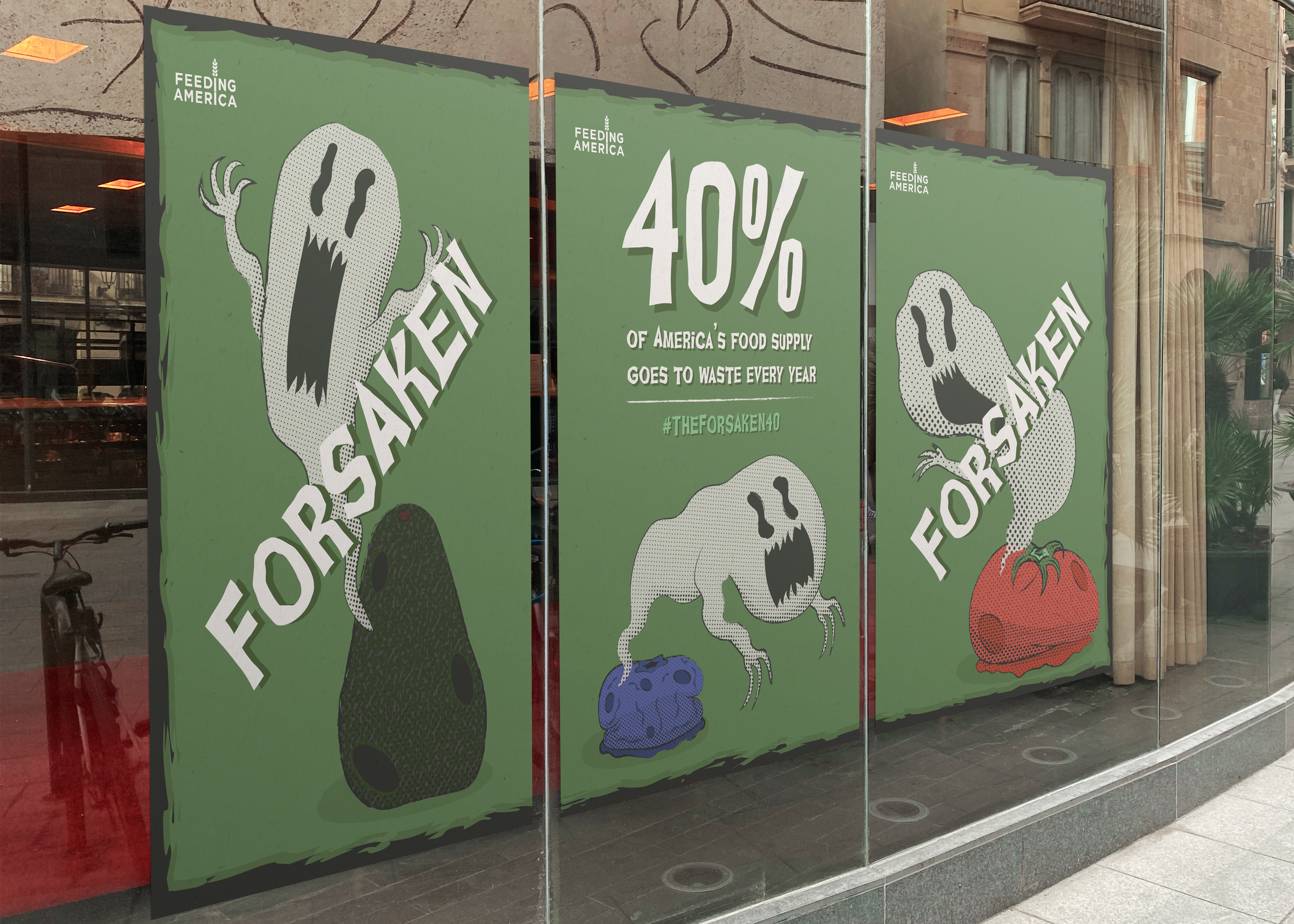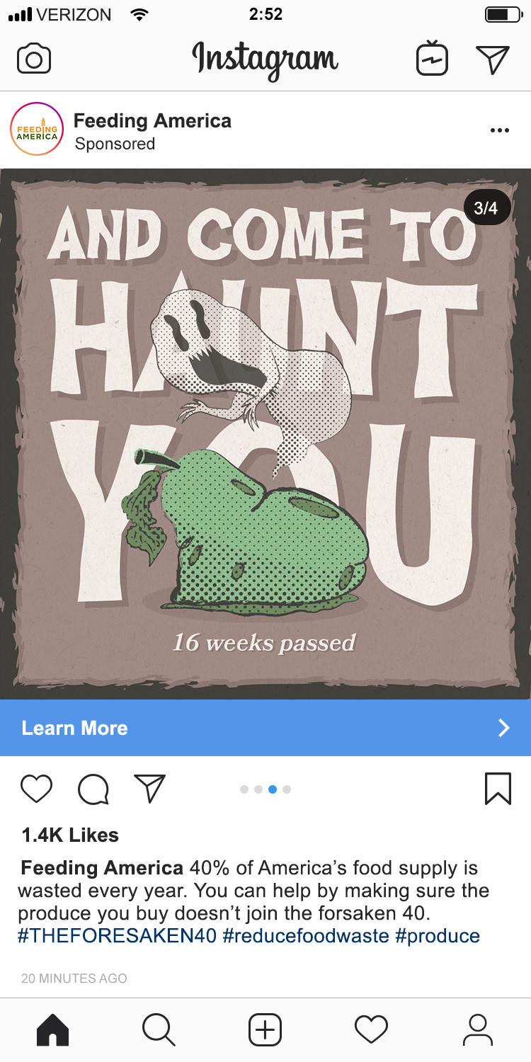 In this campaign for Feeding America, the harrowing 40% statistic is used to convey the horrors of food waste. This project uses retro horror visuals and haunting copy to convey the grave misfortune that befalls produce when it goes to waste. Textures and halftones along with dark muted colors were used to enhance the retro feel. #THEFORSAKEN40 encourages food shoppers to think before they buy.