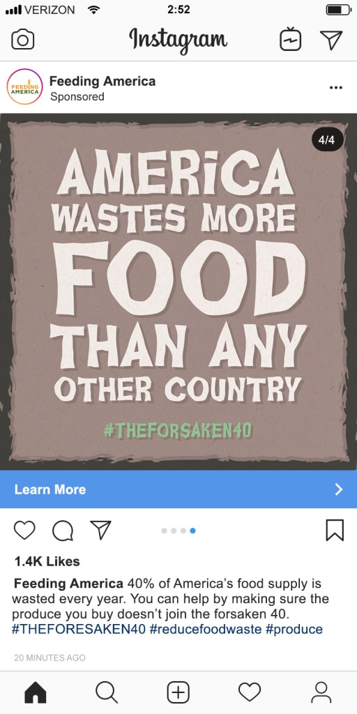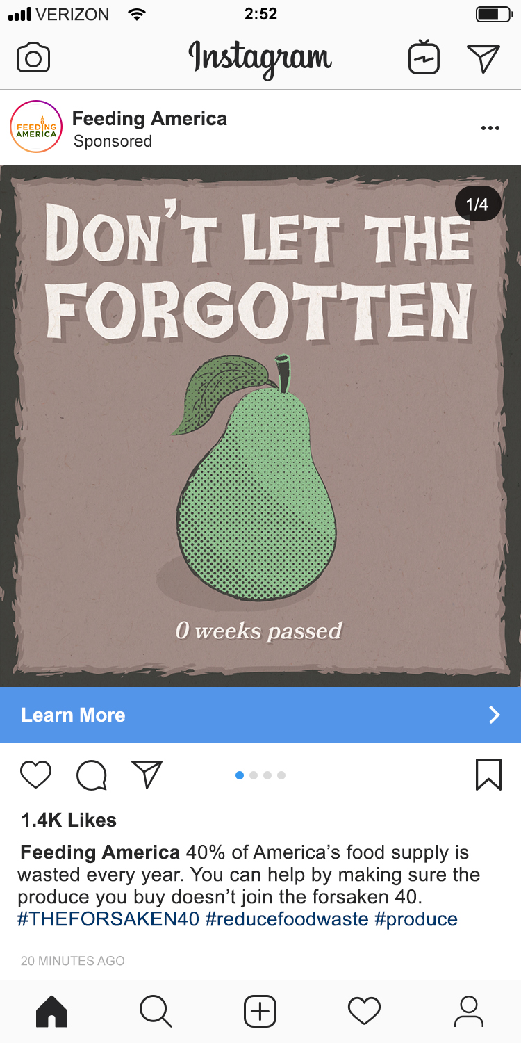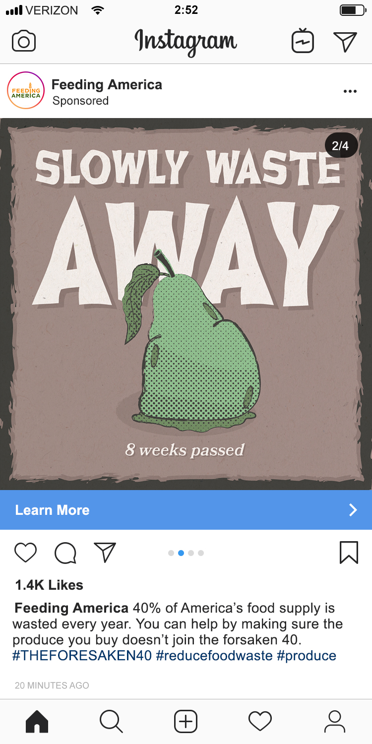 In this campaign for Feeding America, the harrowing 40% statistic is used to convey the horrors of food waste.
