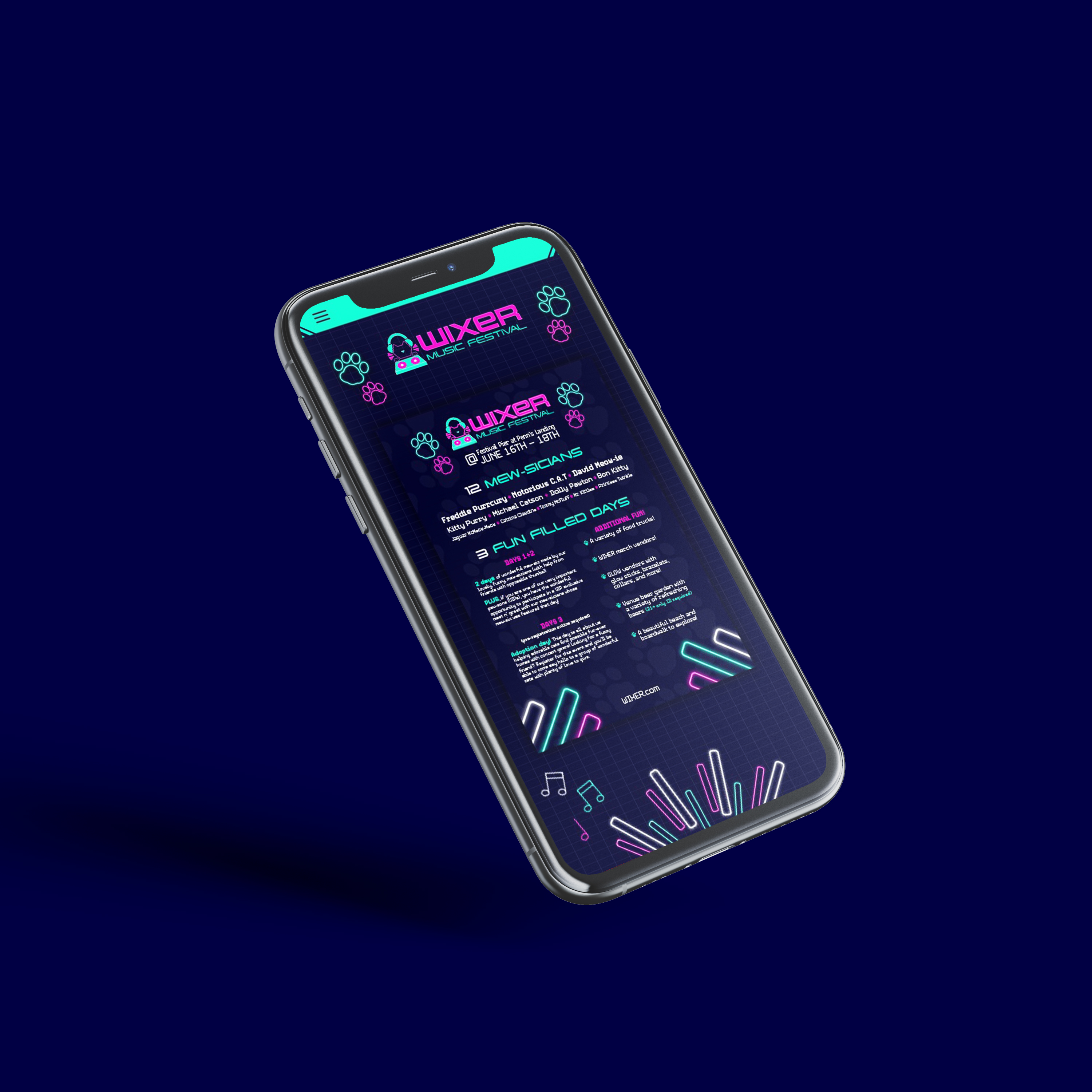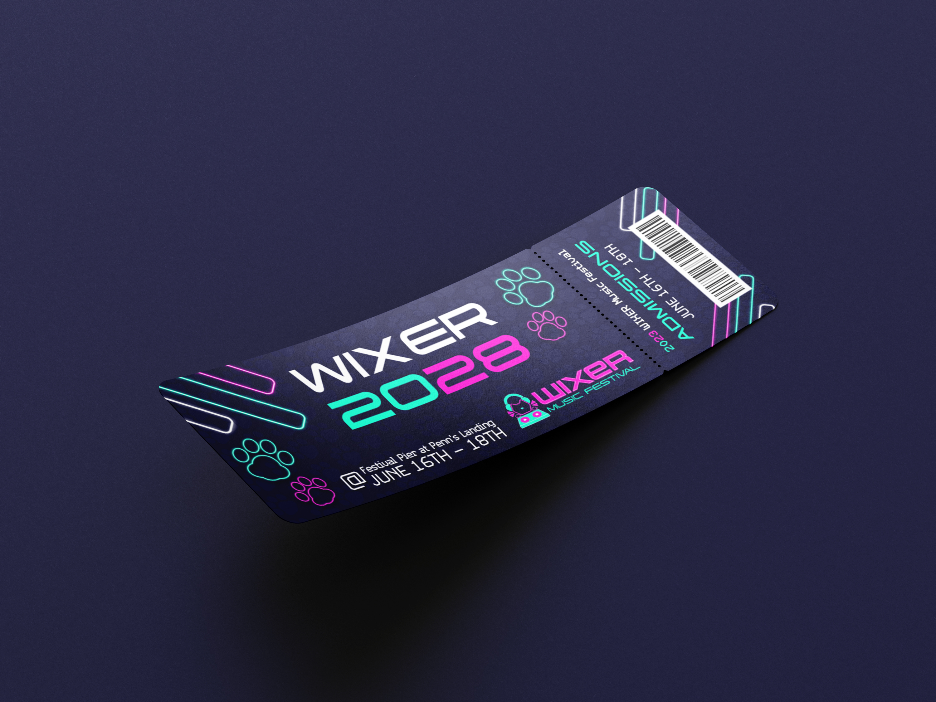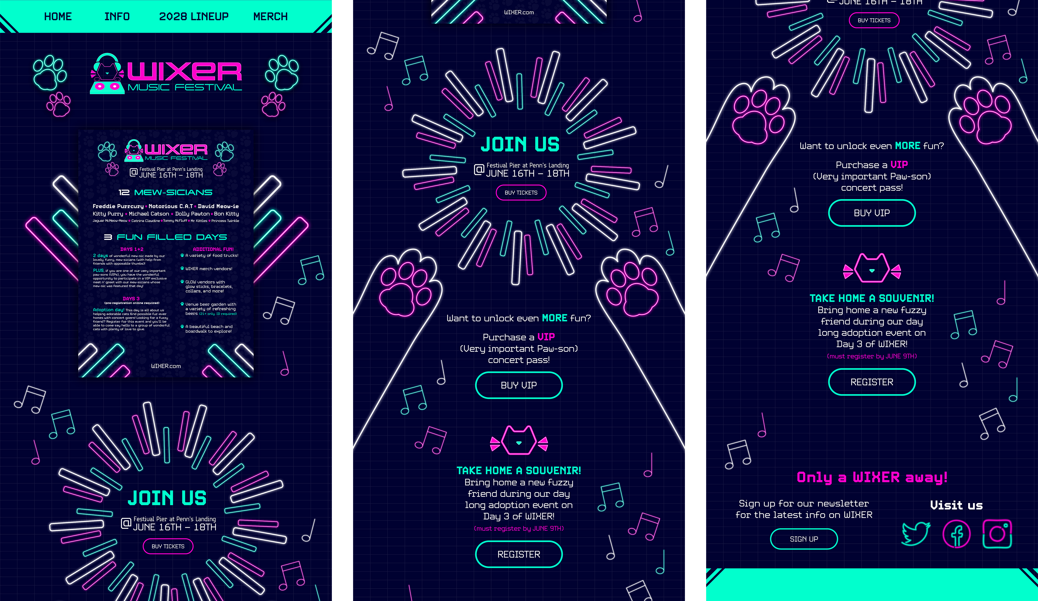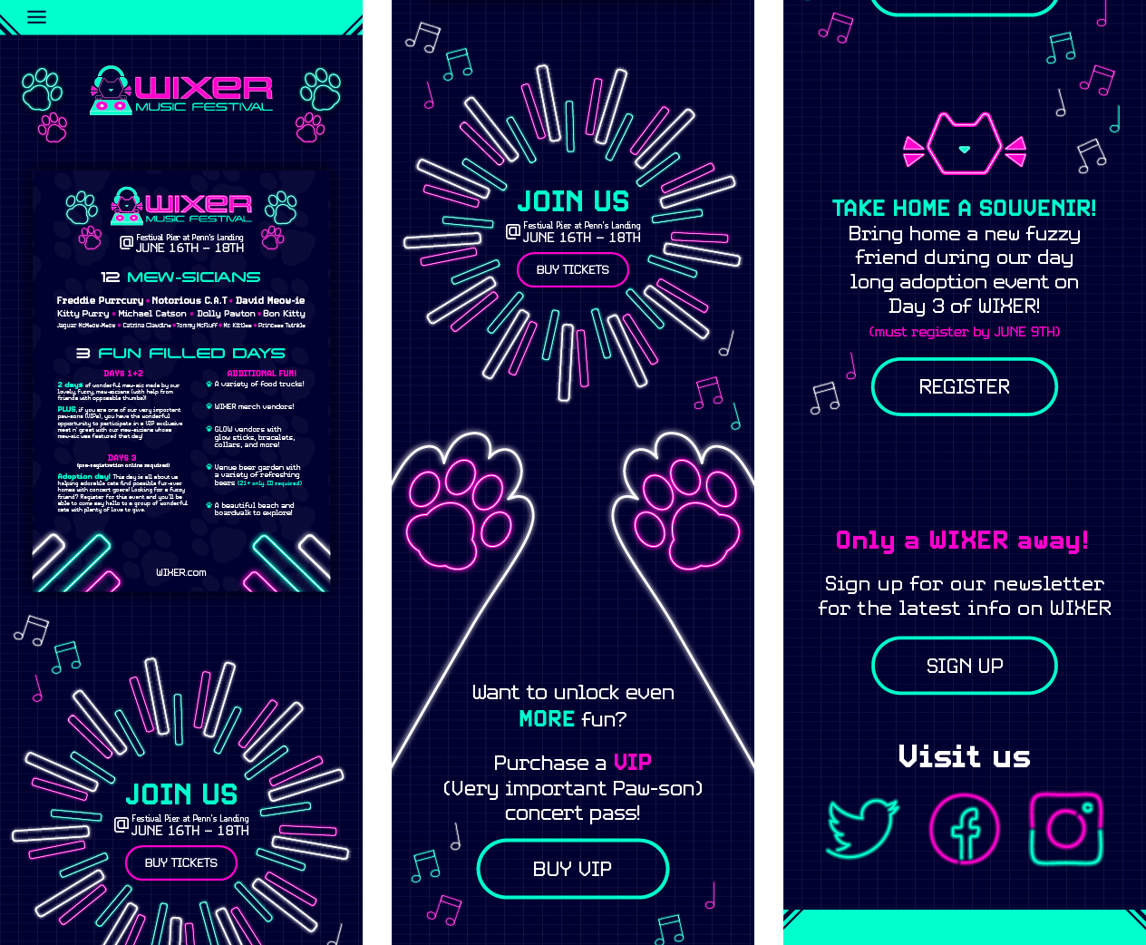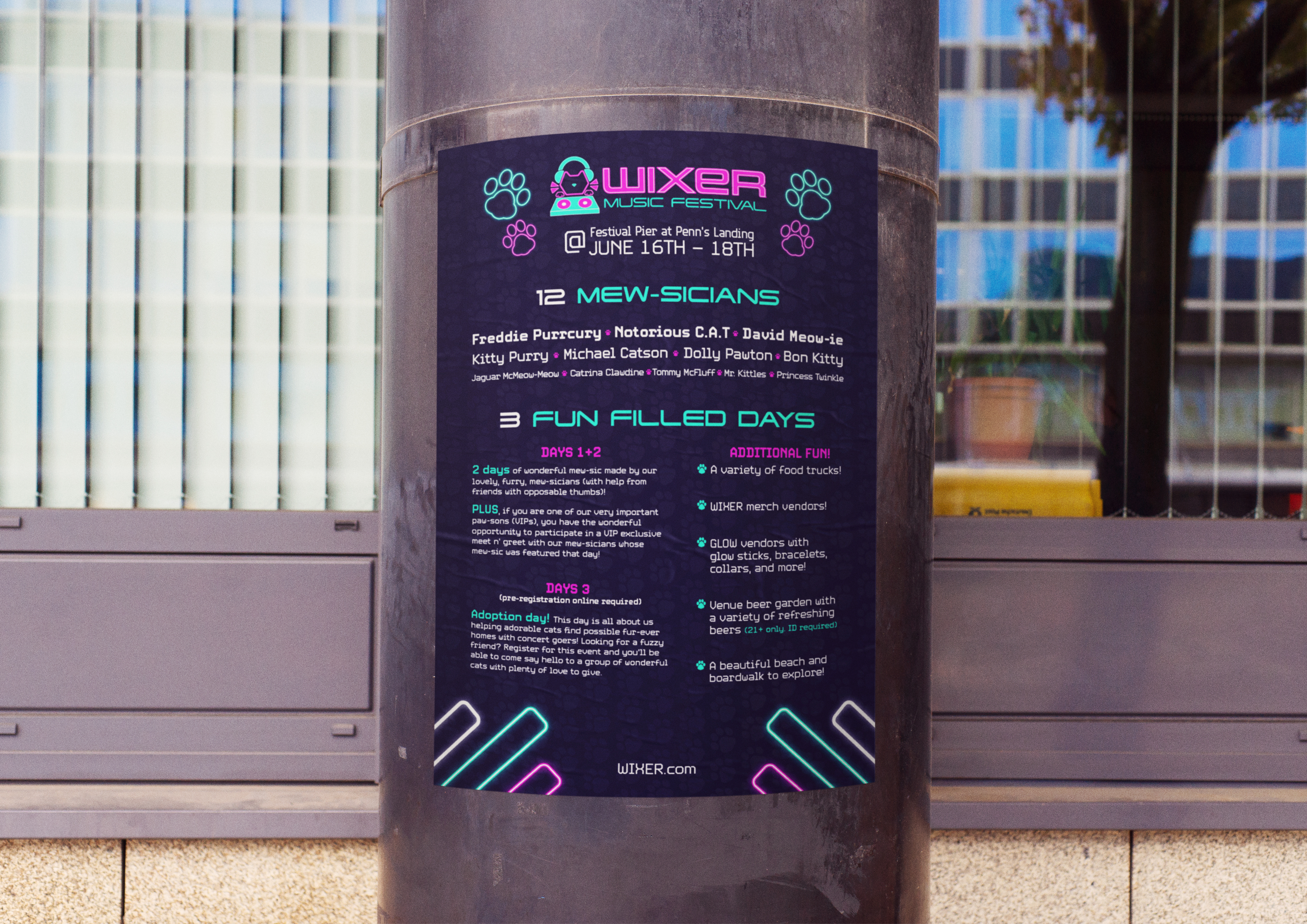WIXER is a cat themed EDM festival where the music itself was created by cats using the recorded sounds of them meowing, playing, purring, scratching and more, along with the usual EDM beats. The cats themselves are available for adoption at a special event during the festival. WIXER mixes festival fun and helps give cats a loving home. Utilizing contrast between dark and light with neon like effects, WIXER event materials are sure to cat-ch the eyes of any who walk by.