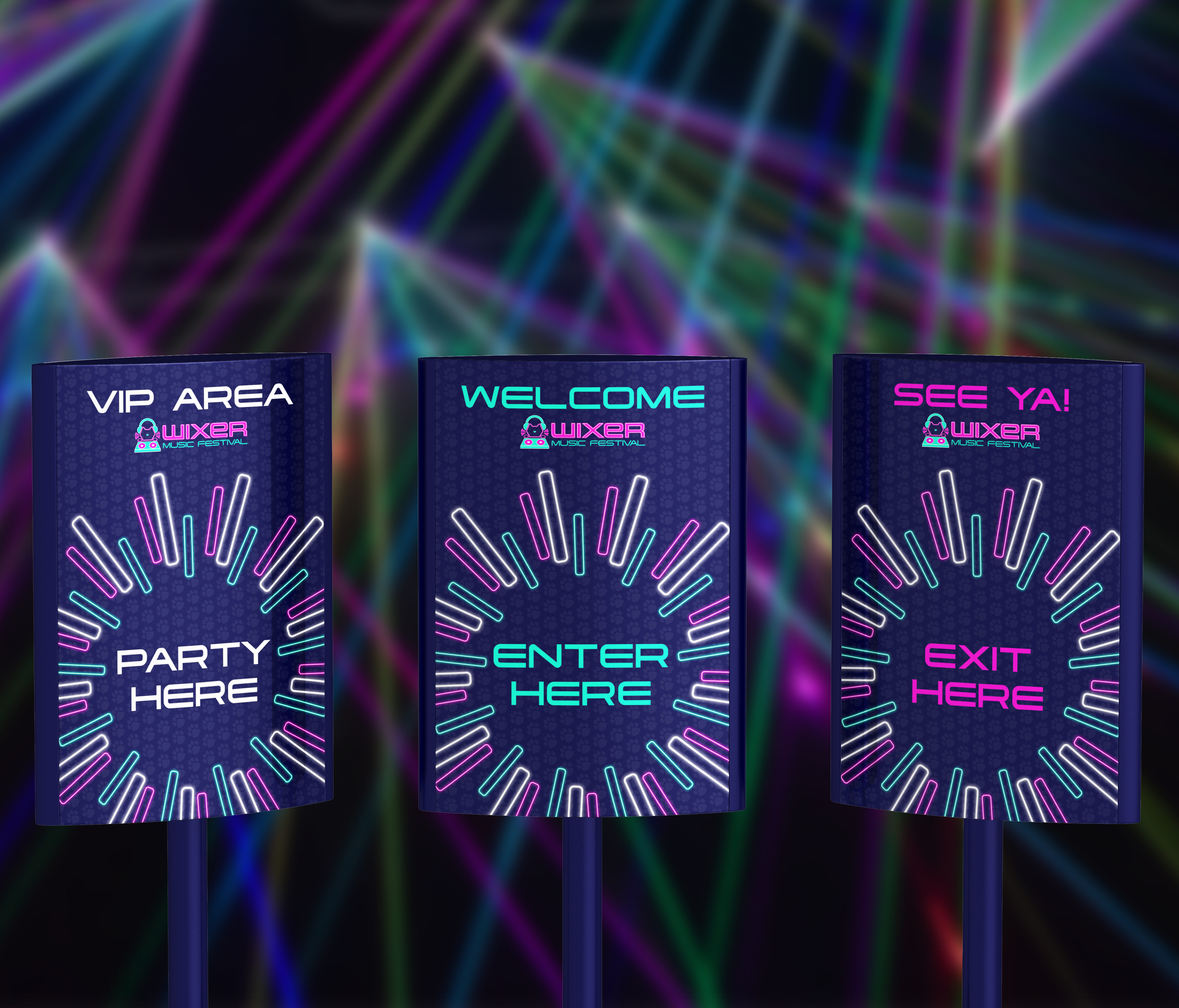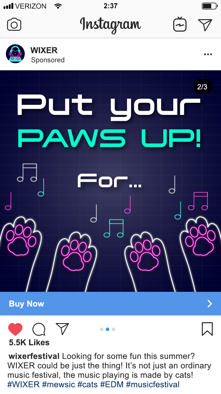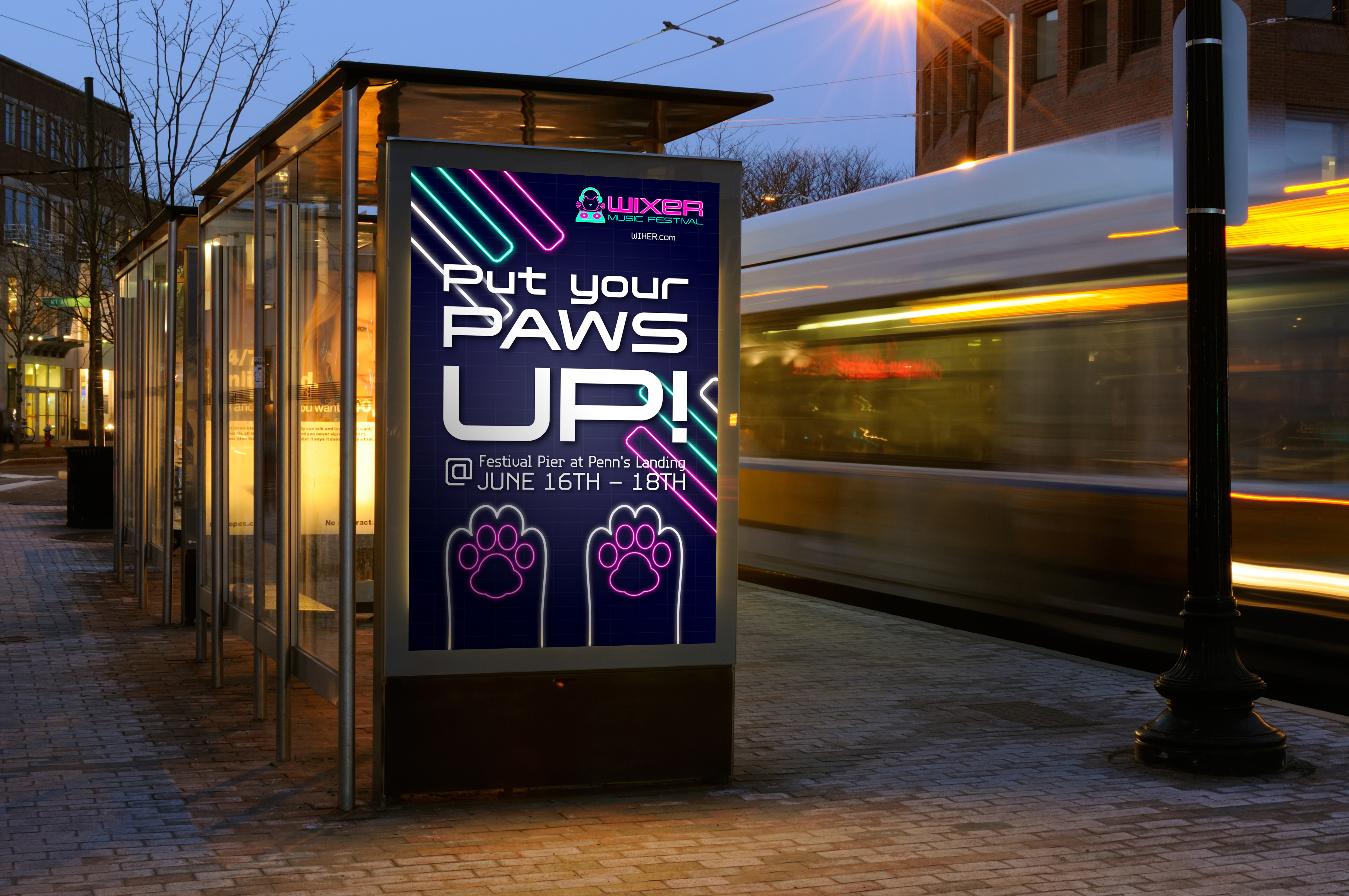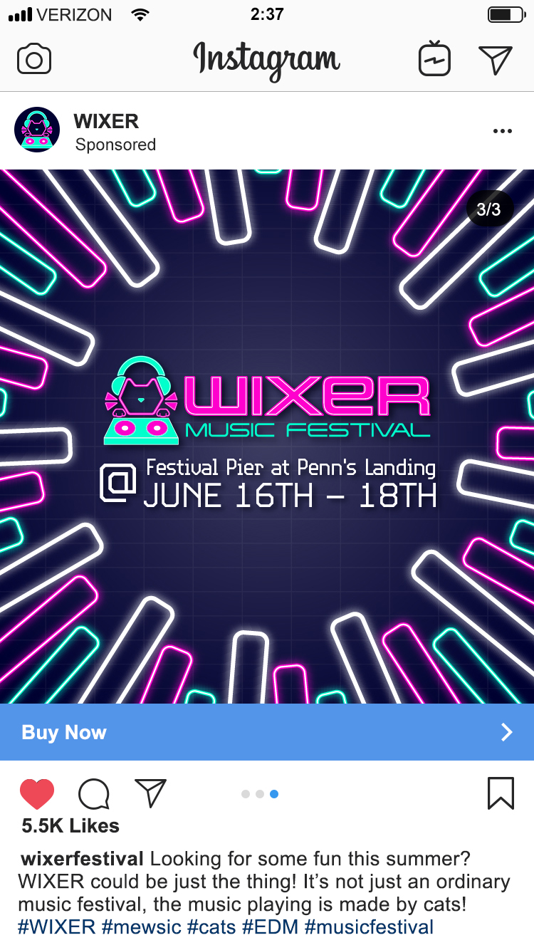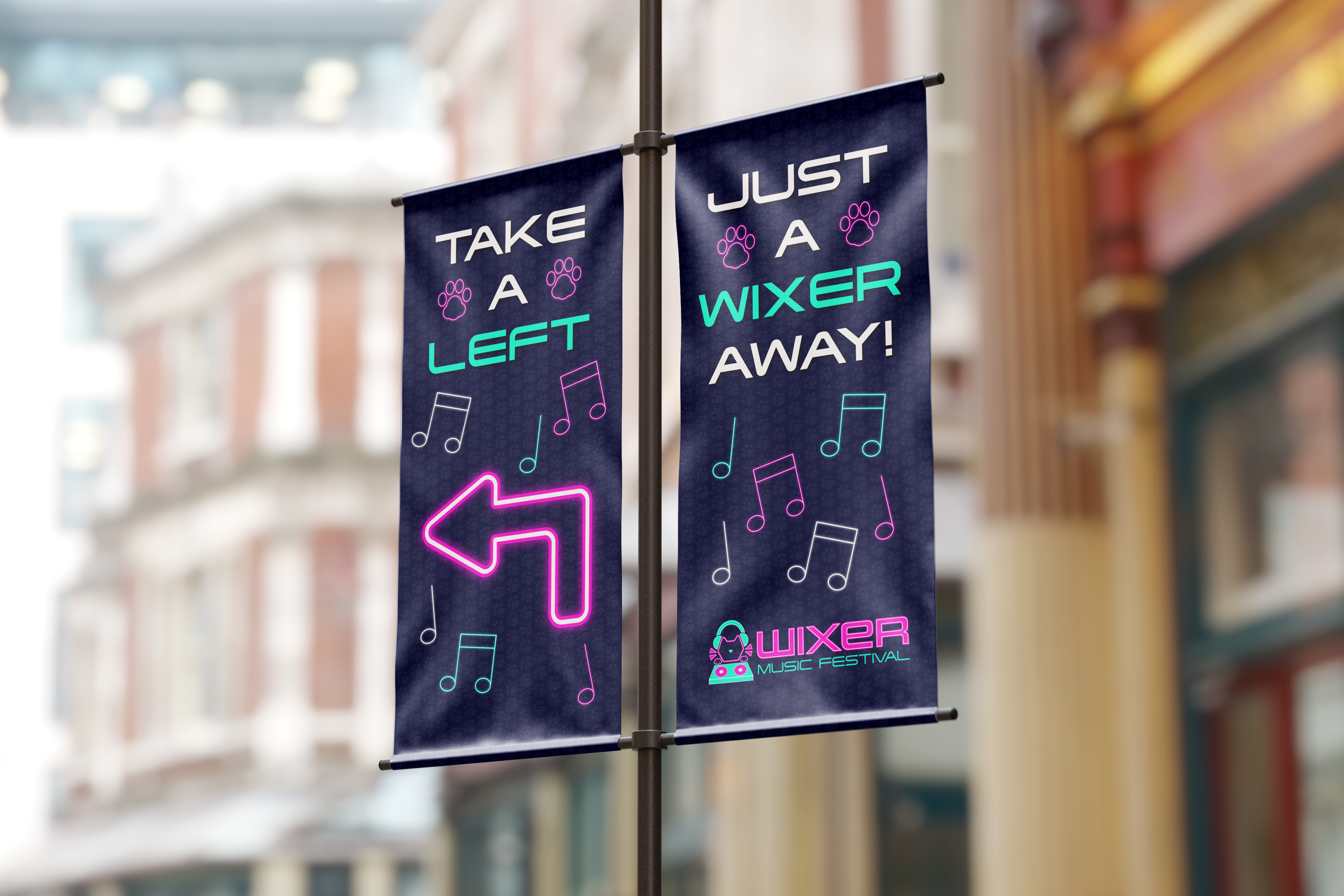 WIXER is a cat themed EDM festival where the music itself was created by cats using the recorded sounds of them meowing, playing, purring, scratching and more, along with the usual EDM beats. The cats themselves are available for adoption at a special event during the festival. WIXER mixes festival fun and helps give cats a loving home. Utilizing contrast between dark and light with neon like effects, WIXER event materials are sure to cat-ch the eyes of any who walk by.