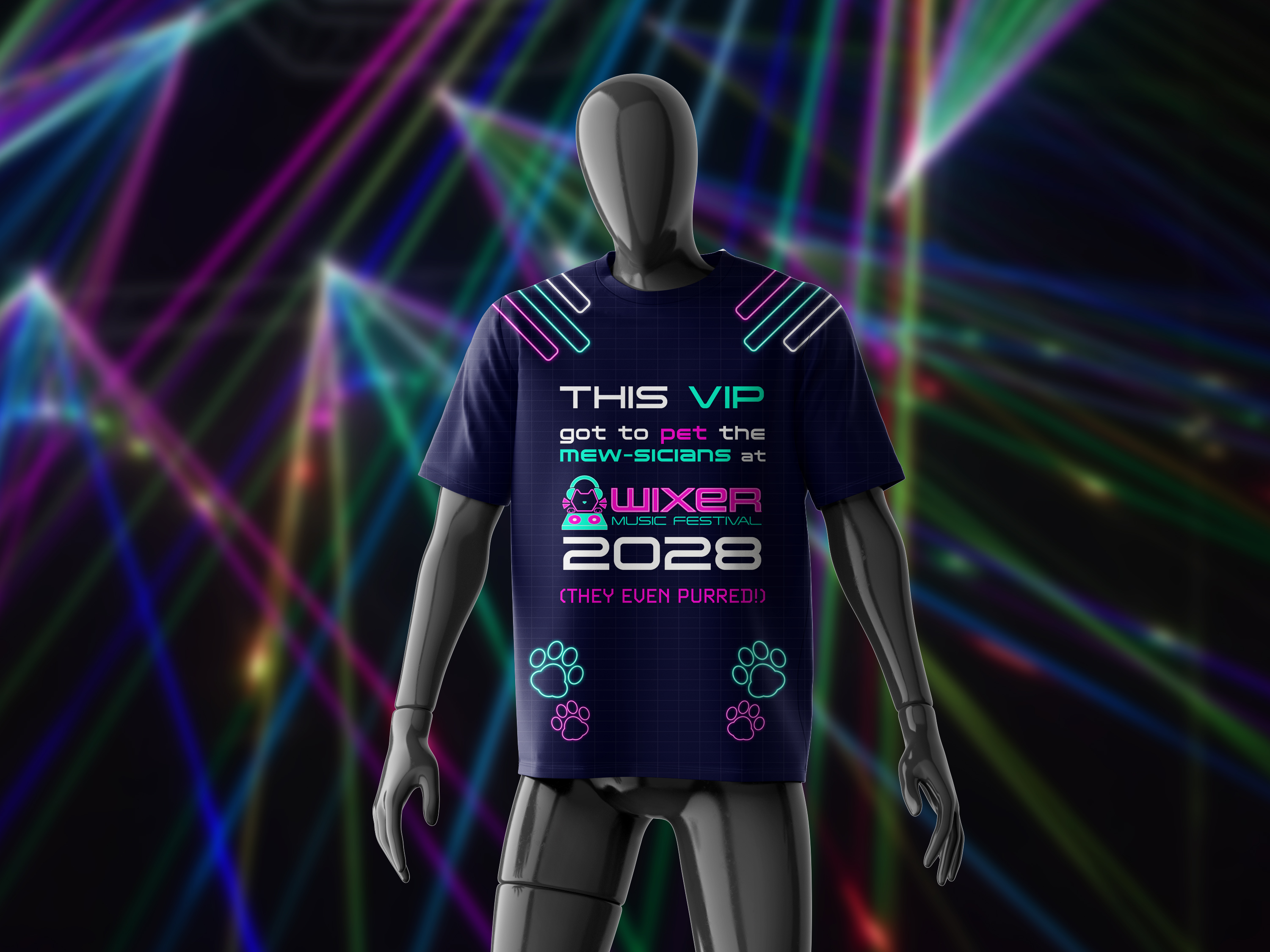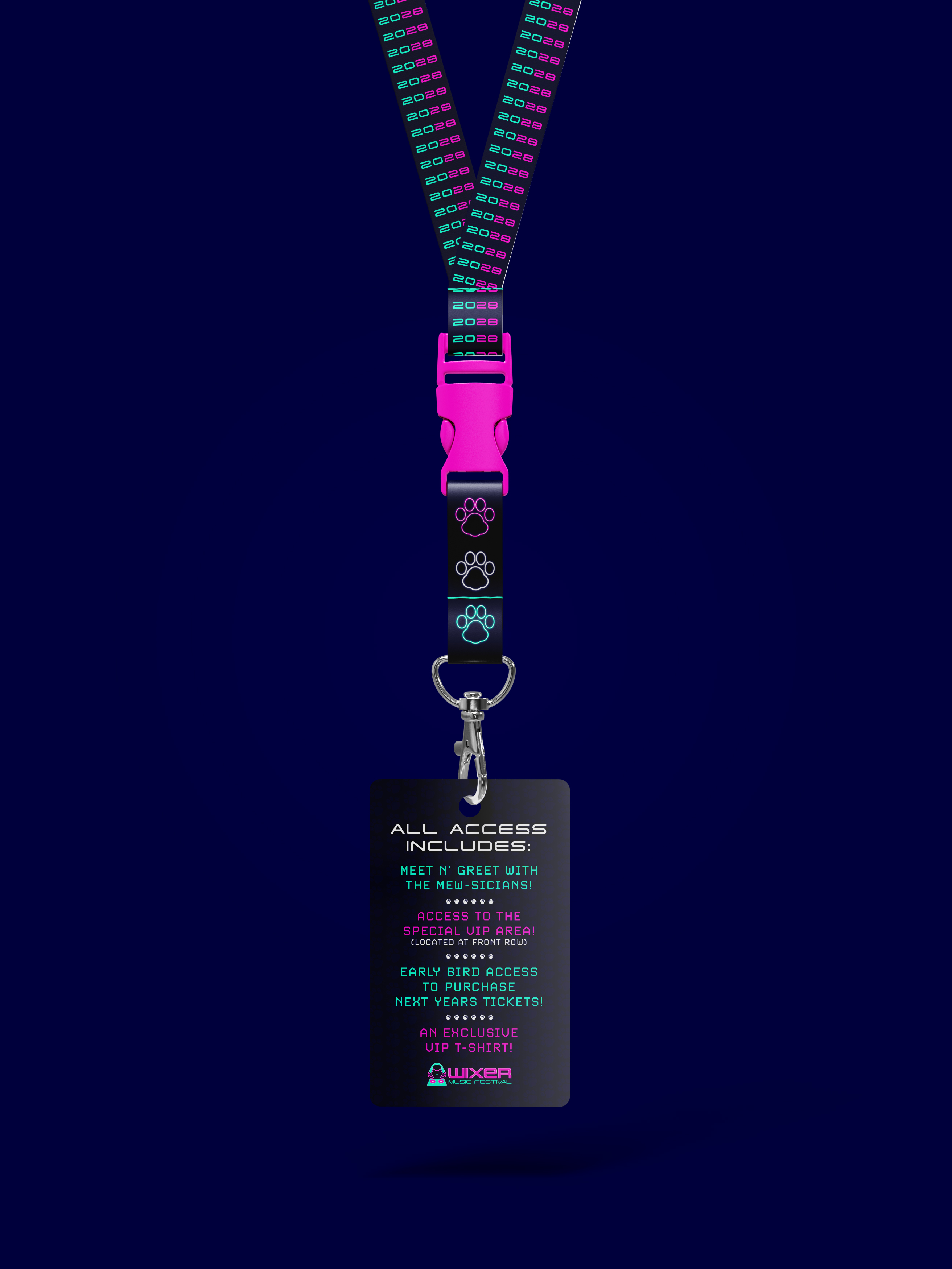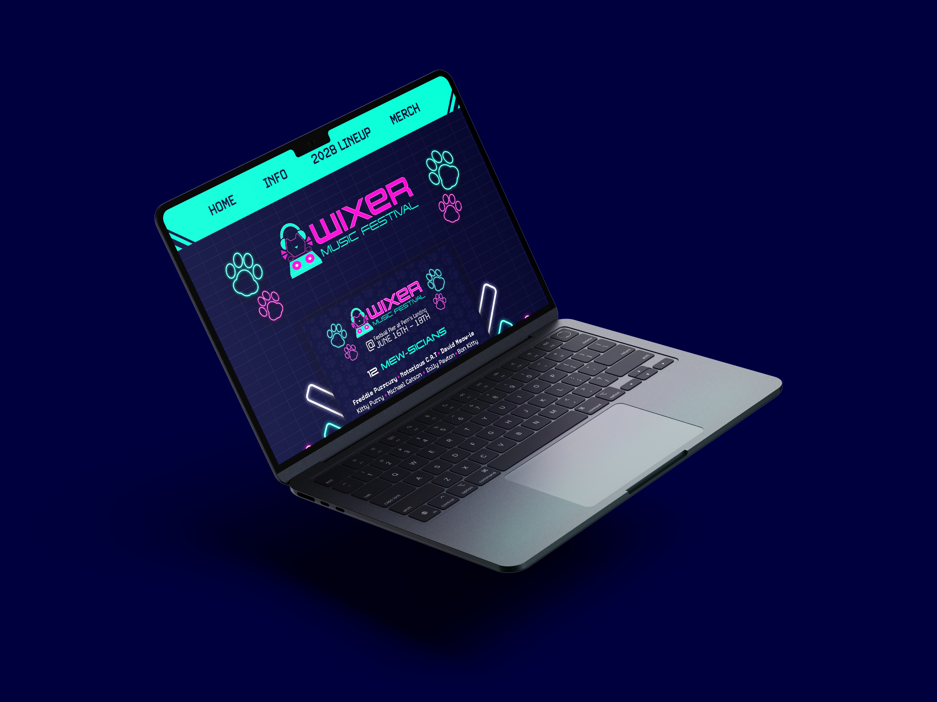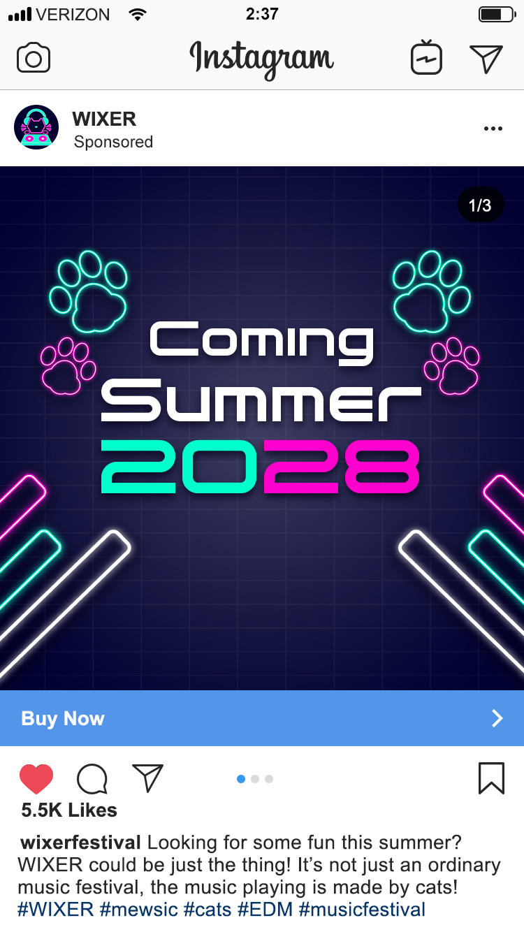 WIXER is a cat themed EDM festival where the music itself was created by cats using the recorded sounds of them meowing, playing, purring, scratching and more, along with the usual EDM beats. The cats themselves are available for adoption at a special event during the festival. WIXER mixes festival fun and helps give cats a loving home. Utilizing contrast between dark and light with neon like effects, WIXER event materials are sure to cat-ch the eyes of any who walk by.